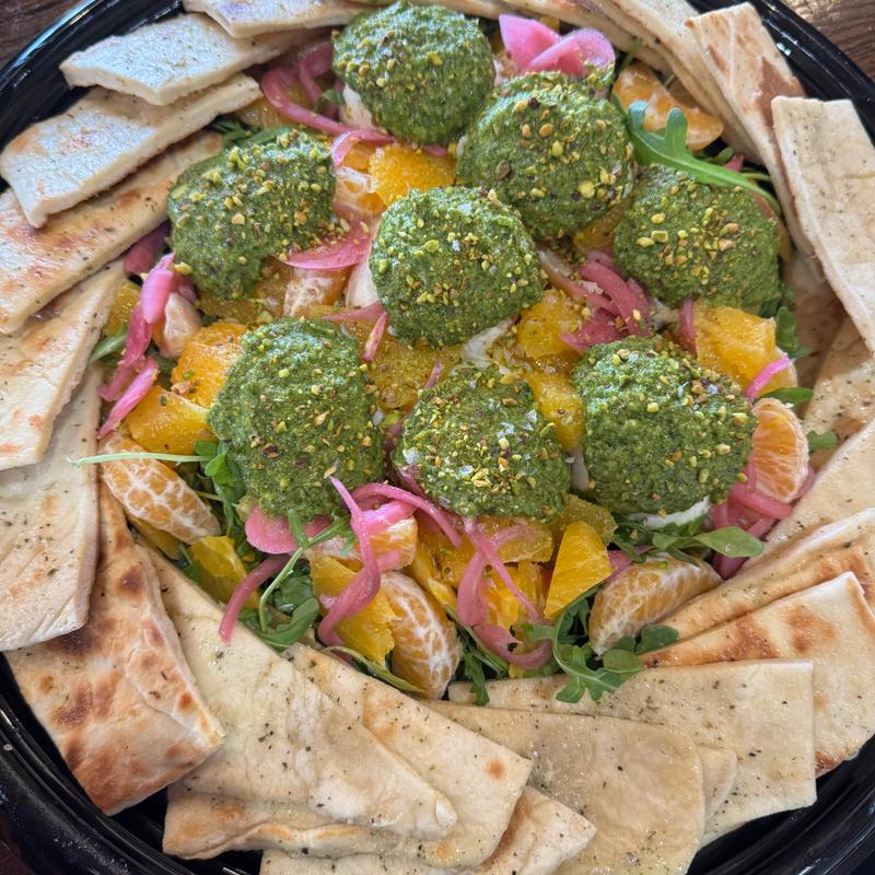 Citrus, Pistachio Pesto*, Arugula, Pickled Red Onion, Flatbread